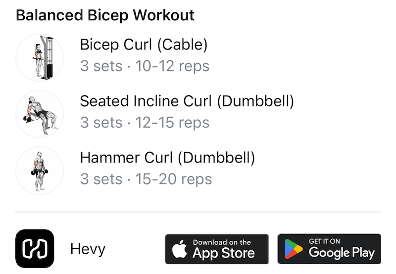 Hevy’s library has 400+ exercises, including numerous bicep movements for the short head. Download the app, explore the exercises, and see how easy it is to add any of them to your workouts and log variables like the number of sets, weight, reps, and RPE.